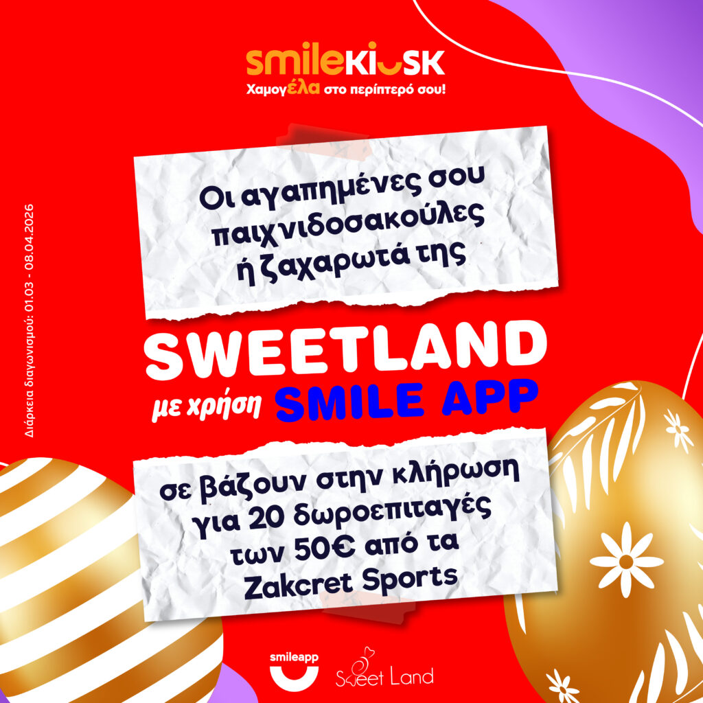 01/03– 08/04/2026 Θέλεις να ανανεώσεις το αθλητικό σου στυλ; Τα Sweet Land και η Smile App σου δίνουν την ευκαιρία να κερδίσεις μία από τις 20 δωροεπιταγές 50€ από τα Zakcret Sports!