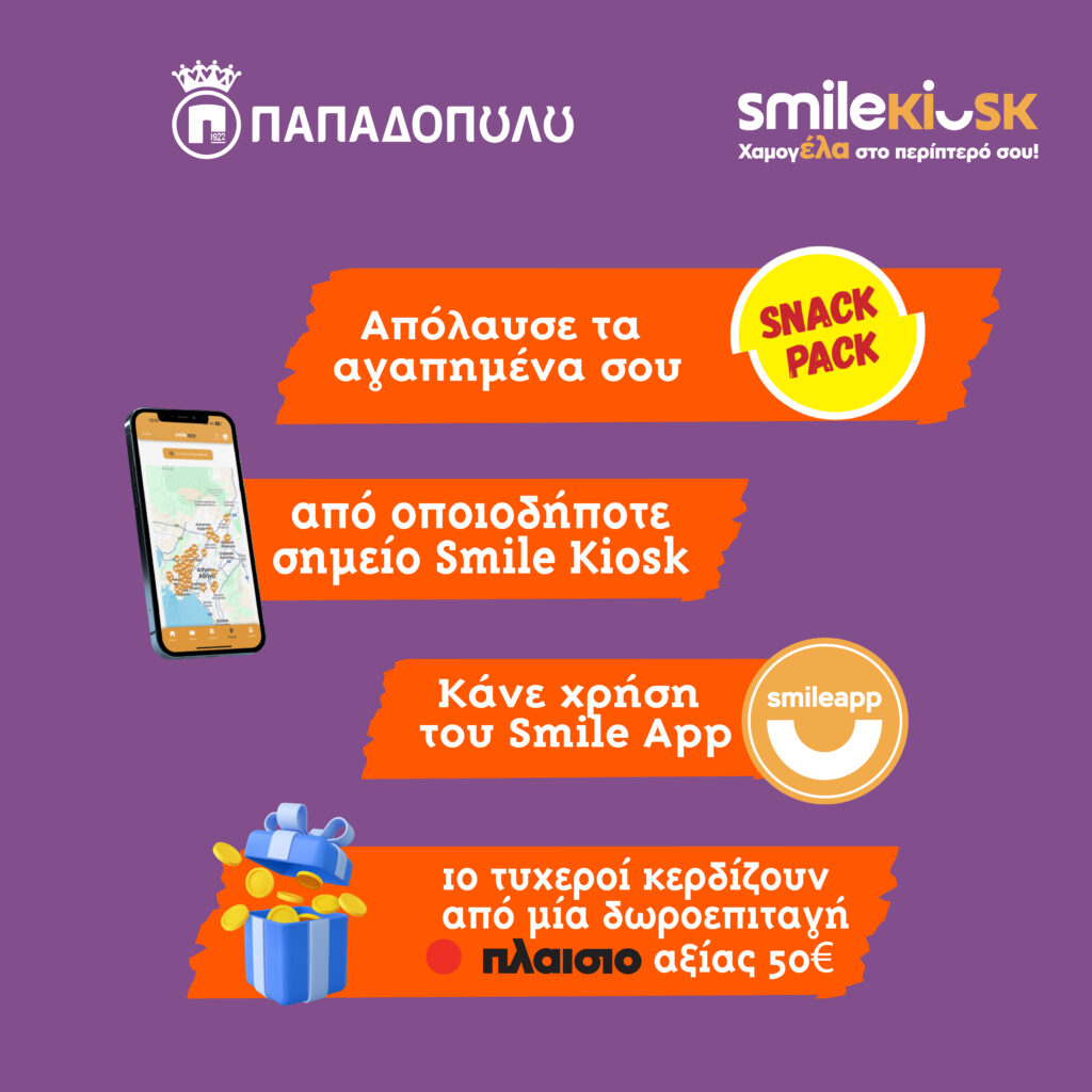 H ομόρρυθμη εταιρεία με την επωνυμία «SMILEKIOSK O.E.» και το διακριτικό τίτλο «SMILEKIOSK» (στο εξής, «η Διοργανώτρια»), που εδρεύει στο Περιστέρι Αττικής, οδός Αρριανού, αριθμ. 3, Α.Φ.Μ. 800841823, Δ.Ο.Υ. Ε΄ Πειραιά διοργανώνει διαγωνισμό με τίτλο «Smileapp Διαγωνισμό Snack Pack Παπαδοπούλου» στο πλαίσιο του Προγράμματος Επιβράβευσης Smileapp για τα μέλη της, με σκοπό την προώθηση των προϊόντων της.